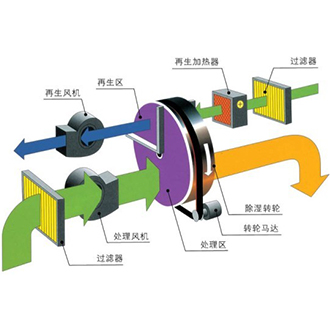 當(dāng)處理空氣通過(guò)轉(zhuǎn)輪的處理區(qū)域時(shí),其中的水蒸汽被轉(zhuǎn)輪中的吸濕介質(zhì)所吸附,水蒸氣同時(shí)發(fā)生相變,變?yōu)橐簯B(tài)水,并釋放出潛熱;這時(shí),處理空氣因自身的水份減少而變成干空氣;之后,處理空氣由處理風(fēng)機(jī)送出,變成干的、熱的空氣。